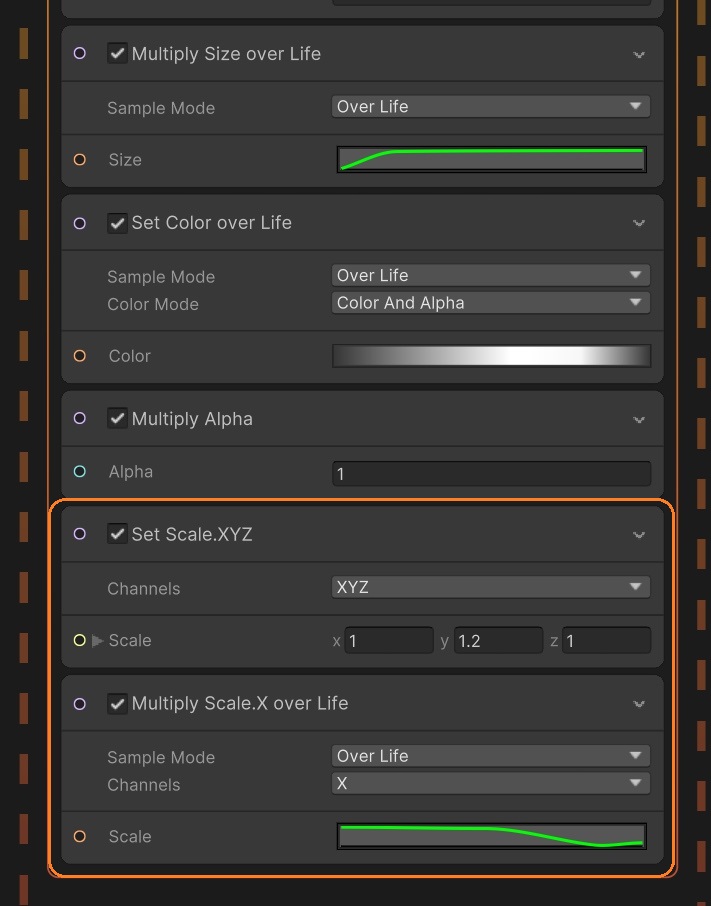 時間によってサイズや色、アルファを変えます。スケールのY軸を大きくして、画像を進行方向に少し伸ばします。時間とともに、スケールのX軸を小さくして、細く消えるようにしています。