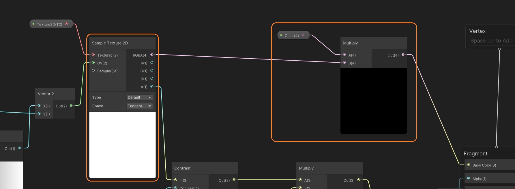 コントラストが小さいと、テクスチャの背景が見えるので、Saturateで0-1の範囲に固定して、プロパティの値をかけ、1を足してからVFXシェーダーグラフに渡します。