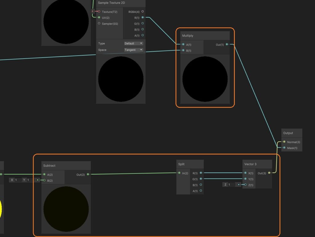 Lerpノードで、サブグラフの出力の法線と、Normal Vectorノードの出力を、サブグラフのマスクで補間します。