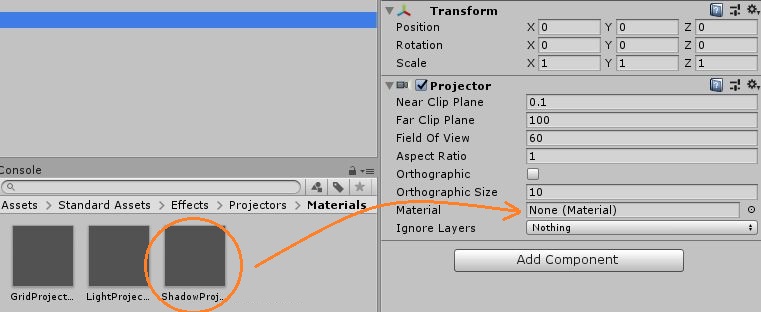 まずカーリングストーンのプレハブに新しい空のゲームオブジェクトを付けて、Projectorコンポーネントを付けました。