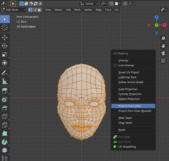 3Dビューポートでテンキーの「1」をクリックして、顔のモデルを正面から見ます。