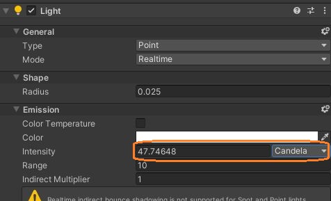 HDRPのライトの単位は、タイプによって様々です。例えばポイントライトには4つの単位があります。